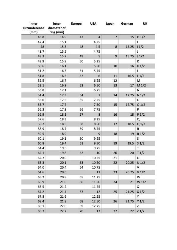 4. this is the inner circumference of the ring (in mm). Find the value in the chart provided.
